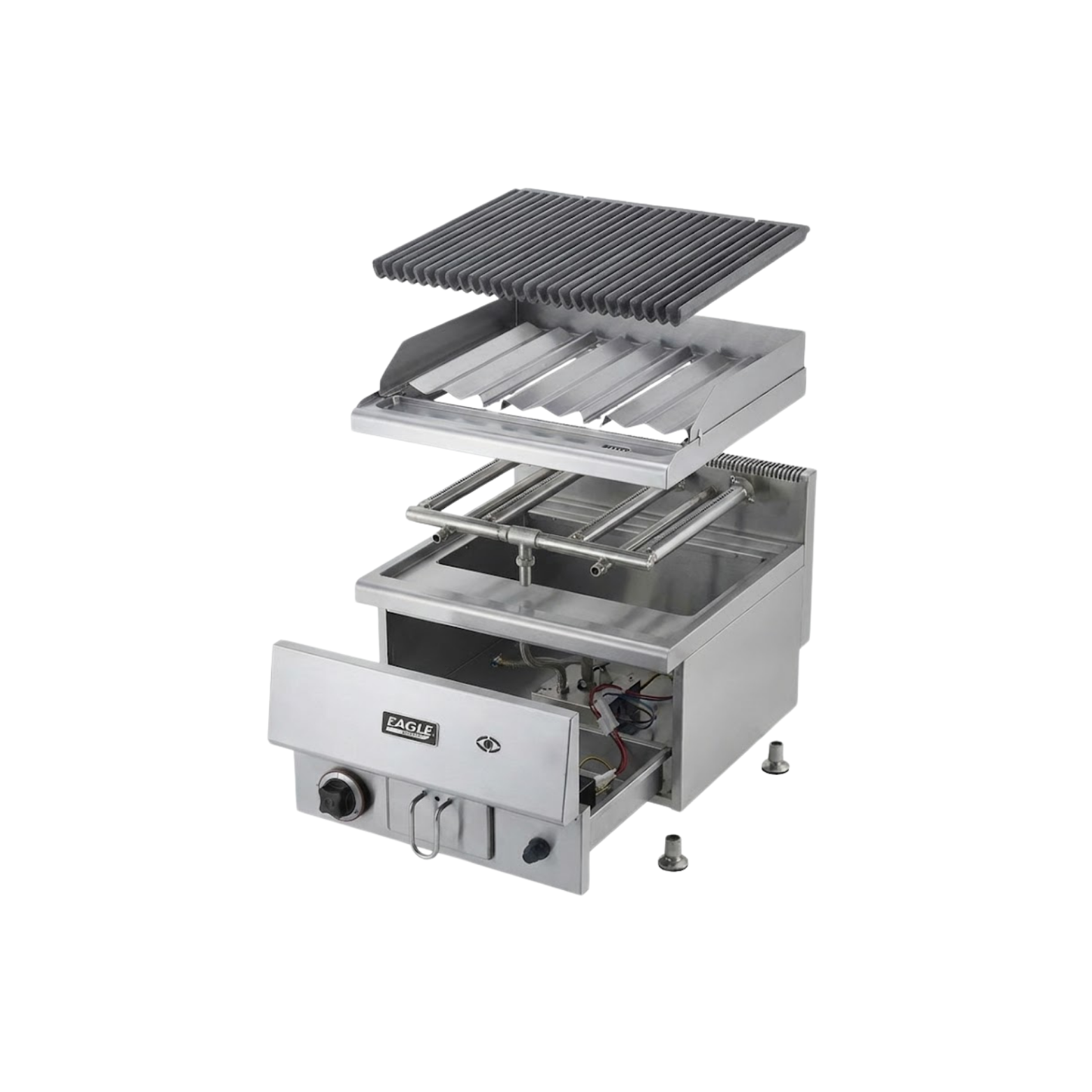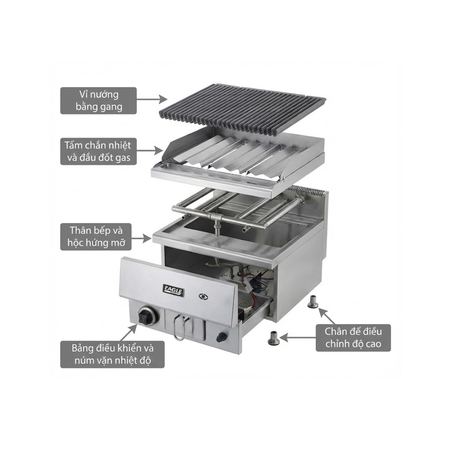 Eagle đã nghiên cứu kỹ thói quen vận hành của đầu bếp để phát triển bếp nướng gas dạng than giúp tối ưu hóa trải nghiệm sử dụng. Thiết bị cho phép người dùng nướng các loại thịt và hải sản với độ chín hoàn hảo, màu sắc đẹp mắt, trong khi vẫn đảm bảo mùi thơm đặc trưng của than, yếu tố mà khách hàng rất yêu thích khi thưởng thức đồ nướng. Thiết kế gọn gàng, chắc chắn, dễ vệ sinh là điểm mạnh khác khiến sản phẩm phù hợp với mọi mô hình F và B từ nhỏ đến lớn.